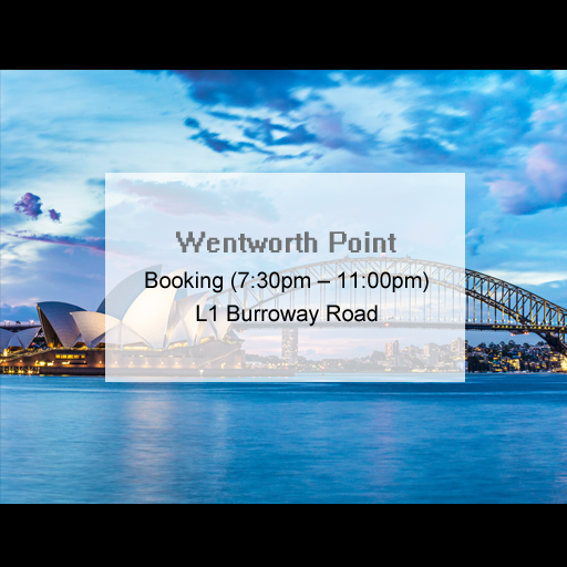 Booking (7.30pm – 11.00pm), Location 1 Burroway Road, Wentworth Point